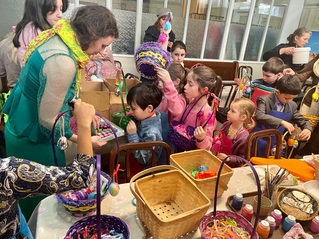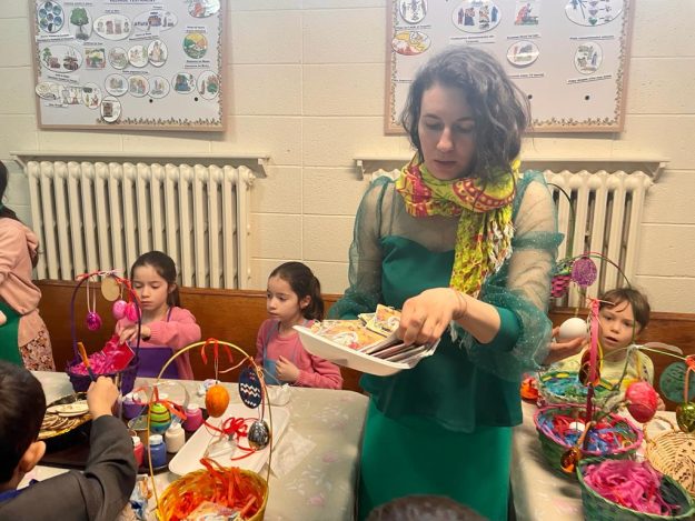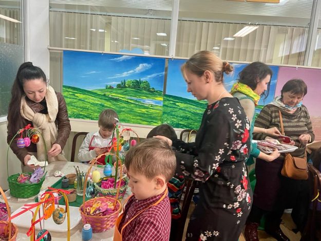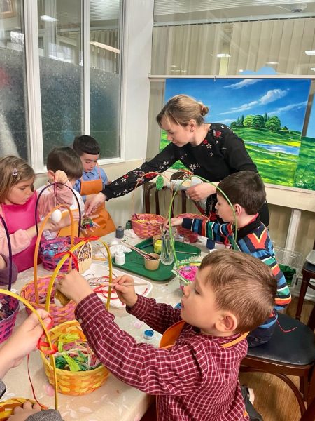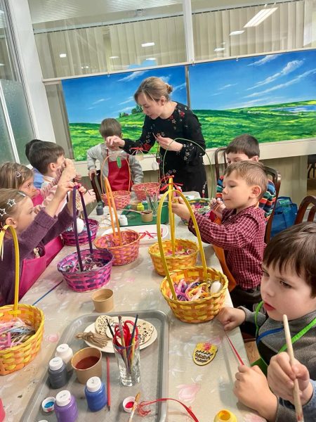 После Литургии состоялся детский мастер-класс, на котором ребята готовили корзиночки к Пасхе. На столах стояло множество цветных баночек, в корзинках лежали разноцветные бумажные ленточки; дети то и дело взмахивали кисточками с новой краской! Не забыли юные художники украсить и пасхальные яйца.