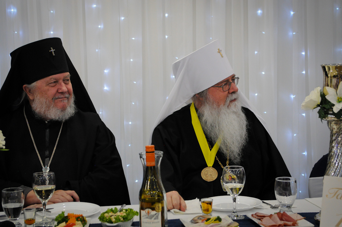 На официальной части обеда прозвучали поздравительные речи Владык и состоялось награждение медалями и грамотами тружеников прихода. Далее гости увидели праздичную концертную программу. Выступил с танцами детский народный коллектив «Русские узоры», прозвучали любимые мелодии, исполненные ансамблем ПетроПавловского прихода: Александром (баян), Славой (аккордеон), Ясоном (скрипка). Зрителям были показаны два небольших фильма: лирико-юмористическая зарисовка о прошлом и настоящем прихода от молодежного клуба и теплые поздравления клира и прихожан, снятые нашей молодежью и смонтированные р.Б. Златой Л. Ведущими были представители молодежного братства ПетроПавловского Собора: Георгий, Роман, Ксения и Анастасия. Сердечно благодарим ребят за этот непростой труд, смелость, душевность и находчивость! Отдельную большую благодарность выражаем м. Ирине Мельник за заботу о праздничном столе и обстановке: было уютно и вкусно!