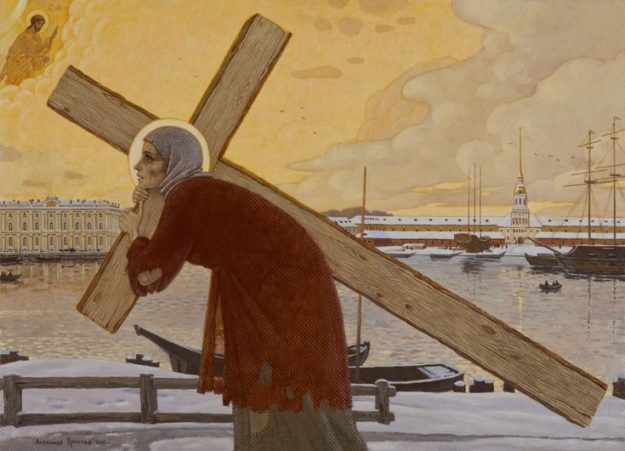 Ища правды распятого Христа, блаженные и сами распяли себя и пронесли через свою жизнь поистине великий крест трудов, скорбей и испытаний. Трудно даже представить себе, что претерпела блаженная Ксения за долгие годы страннической бездомной жизни в Петербурге. Лютые и долгие северные морозы, голод, болезни, насмешки, оскорбления, побои… Эту великую чашу страданий она выпила до дна. В Евангелии сказано, что Христос победил мир и что Его верные последователи также побеждают мир. Что означает – победить мир? Для христианина победить мир означает сохранить свою любовь и единение со Христом, пронеся эту любовь через все скорби, страдания и тьму века сего, а нередко и через открытую вражду и злобу, с которыми мир обрушивается на истинных последователей Христовых. Так побеждали мир святые апостолы, с радостью шедшие на смерть за проповедь Евангелия. Так побеждали мир мученики первых веков, на которых мир обрушивался поистине с дьявольской злобой, но эта злоба не смогла угасить пламени их любви ко Христу. Так побеждали мир и Христа ради юродивые, пронесшие свою любовь через великий подвиг скорбей и испытаний.