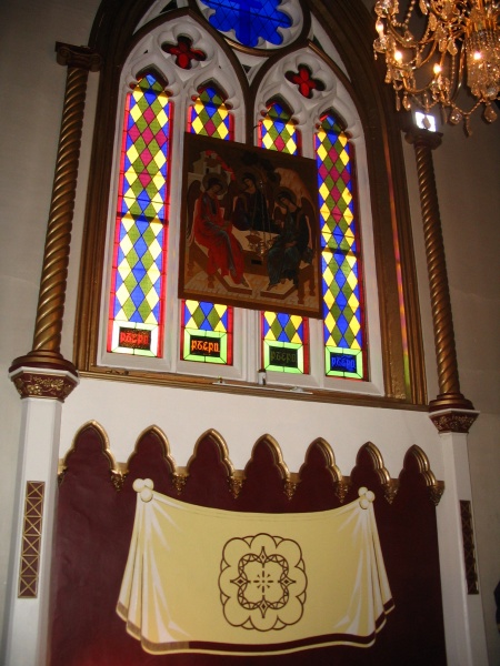 Завершилось украшение Горнего места главного алтаря нашего Собора. Как мы знаем из прежних публикациё и объявлений, Церковный совет принял решение построить киот, взяв за центр восточное витражное окно и икону Святой Троицы. Киот получился очень величественный, что как раз соответствует его назначению. Проектная стоимость всей работы — 2000 долларов. На сегодняшний день прихожане пожертвовали на киот в церковную кассу около 900 долларов.