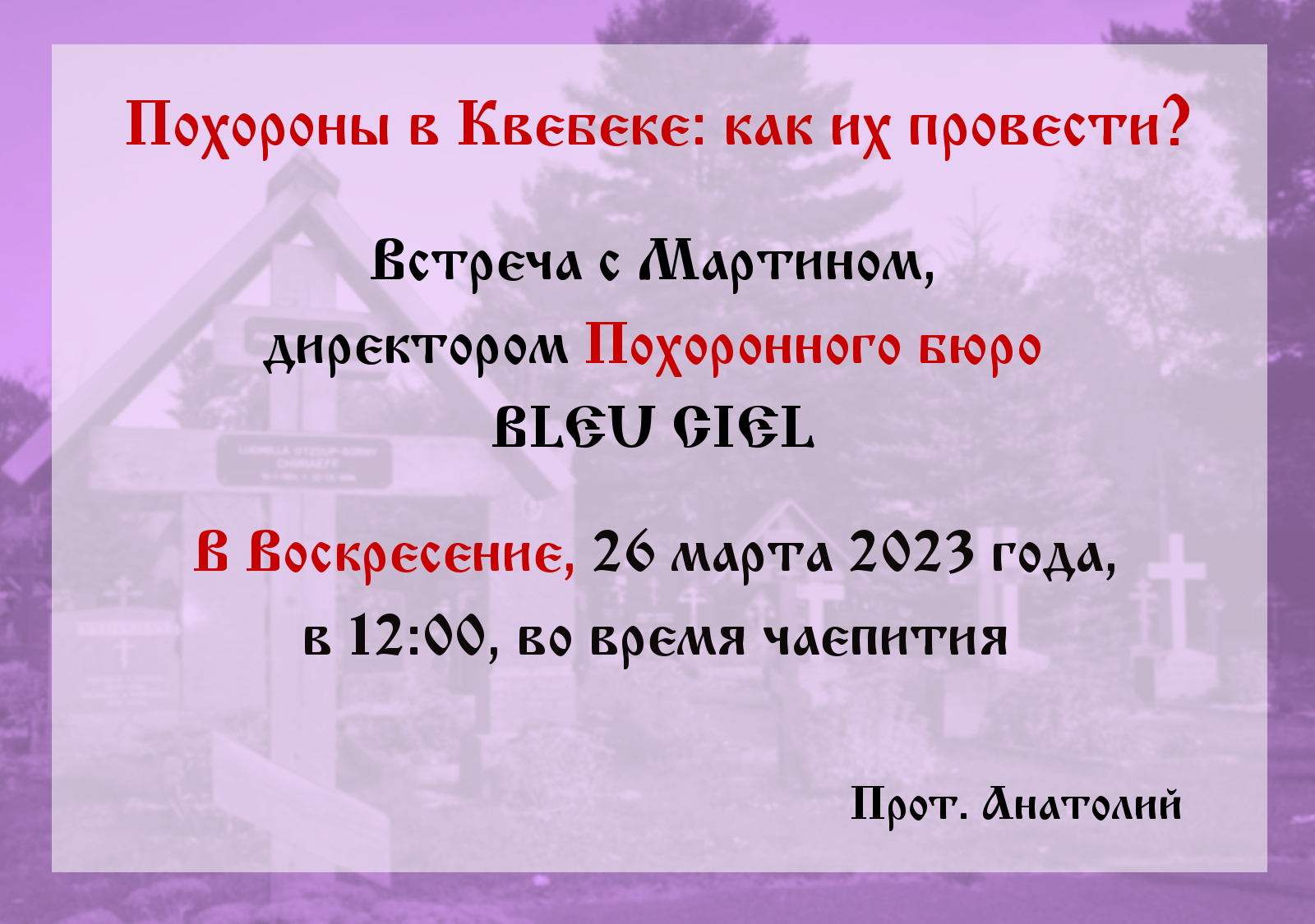 Дорогие братья и сестры, в воскресение, 26 марта, во время чаепития, состоится встреча с директором похоронного бюро “Bleu Ciel” Мартином. Он расскажет о том, как проводятся похороны в Квебеке, и ответит на имеющиеся вопросы.