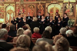 Концертное выступление в нашем приходе состояло из двух актов. Первый, во время которого исполнялись церковные песнопения, проходил в самом Соборе на ступеньках солеи. Несмотря на рабочий день, более 120 слушателей собрались на концерт. Для них были устроены сидячие места, хотя, как известно, в наших храмах молятся стоя.