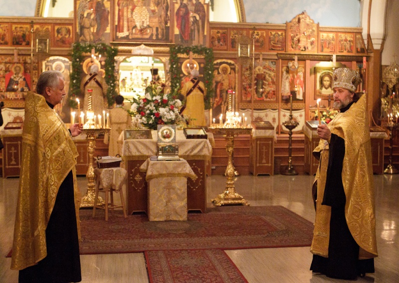На следующий день в субботу Собор был открыт на протяжении 12 часов, чтобы все желающие поклониться святым мощам смогли это сделать. Так устроил Господь, что пребывание частицы мощей святого равноапостольного князя Владимира в нашем Соборе совпало с прибытием в Монреаль Первоиерарха Американской Православной Церкви Блаженнейшего митрополита Ионы и 85-летней датой пребывания нашего прихода в нынешнем здании Храма. Его Блаженство Митрополит Иона в сослужении епископа города Квебека Иринея, настоятеля собора митрофорного протоиерея Анатолия Мельника и других священнослужителей отслужил Божественную Литургию в воскресенье 24 октября. Вот такой благодатный подарок получил наш Собор на свою юбилейную дату.