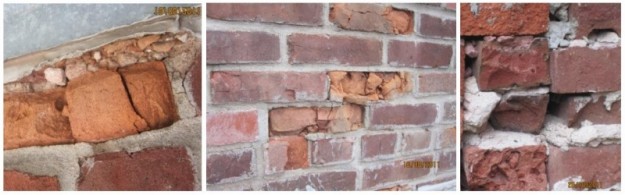 Разрушение стен и каминных обрамлений приняло очень серьезный характер: отсутствует цемент, кирпич раскалывается, протекают стены , разрушается структура кирпича.