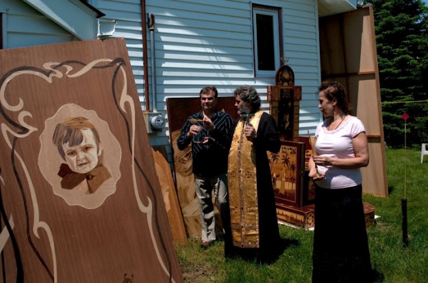 11 июня, 2012 г. Освящение отцом Анатолием уникальной коллекции деревянной мозаики Валерия Карасёва, перед её отправкой в Нижегородский музей.