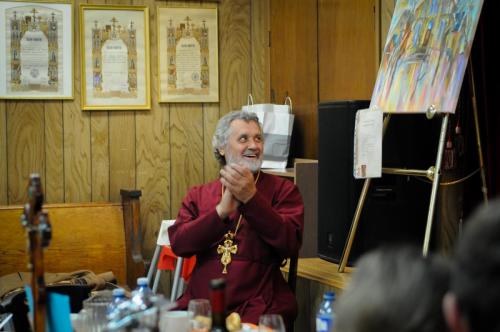 О. Анатолий много рассказывал об истории Петропавловского прихода, отмечая, как одно к другому складывал Господь события, чтобы оказаться нам в новом храме: от проявленной смелости константинопольских эмигрантов до благосклонно отнесшихся к идее продажи здания англикан. Рассказывал также, что помещения, в котором находится трапезная, до времен Великой Депрессии (30-е годы XX века) не существовало ― место это очищали от земли люди, потерявшие работу и имевшие одну заботу: прокормить свои семьи. Была построена сцена, а также устроено место под Пушкинскую библиотеку. Зал назвали Русским.