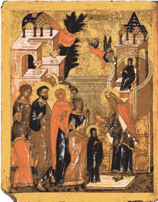 Маленькой Марии было три года, когда ее родители, праведные Иоаким и Анна, исполнили обет, данный Господу, и привели Дочь свою к Иерусалимскому храму ― отдать Ее в дар Богу. Душа Марии, вскормленная молитвами Ее родителей, была полна добрых качеств. «Трилетствующая телом и многолетствующая духом, ширшая Небес и Горних сил превышшая» (5-й тропарь 3-ей песни канона), поднимается Мария по пятнадцати большим ступеням, ведущим ко храму. Там Ее ожидает первосвященник Захария. Он совершает, с обычной точки зрения, невозможное: отводит Марию в Святая Святых. Это самое священное место храма, куда один только первосвященник мог заходить раз в год. Мария же, как пишет свт. Григорий Палама, «в этом (раннем) возрасте будучи исполнена божественных благодатей и не лишенная зрелого ума, более чем прочие сознавала значение того, что совершалось тогда в отношении Ее, и тем, что было в Ее силах, показала это: так что не столько Она была ведома, сколько Сама по Себе приступает к Богу по Своему почину, как бы естественно окрыляемая к священной и божественной любви и полагающая за вожделенный и за достойный Ее (Девы) вход во Святая Святых и обитание там».