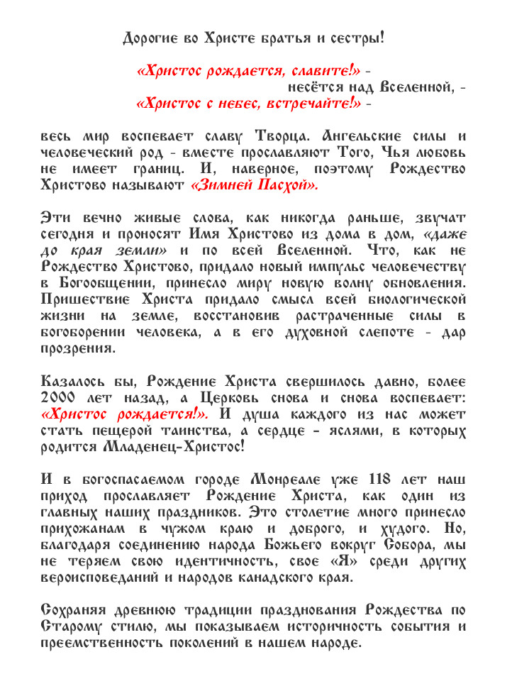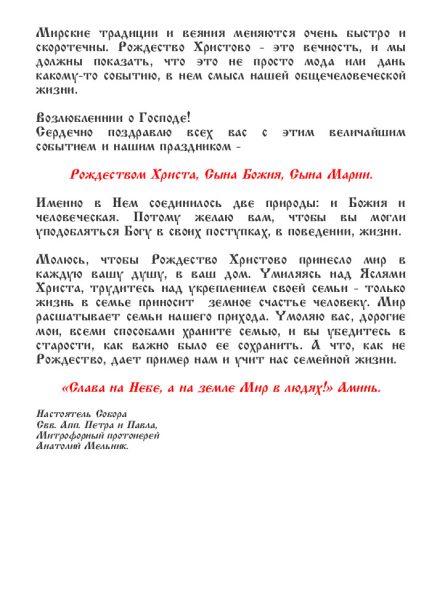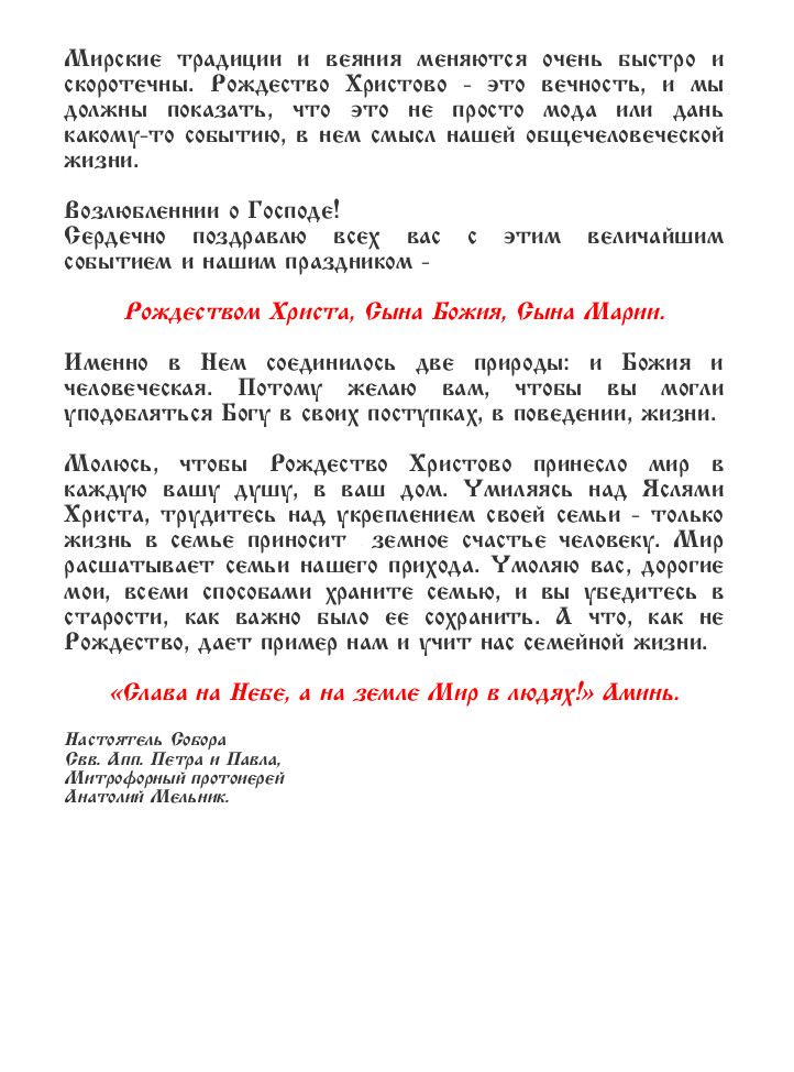РОЖДЕСТВЕНСКОЕ ПОЗДРАВЛЕНИЕ НАСТОЯТЕЛЯ